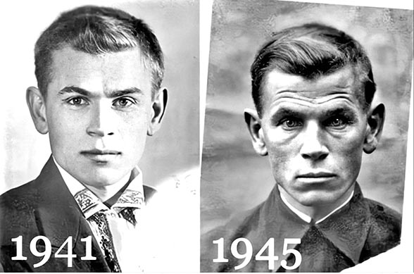 Чуть ниже две фотографии одного и того же двадцатилетнего человека, только разница между снимками 4 года, 1941 и 1945…