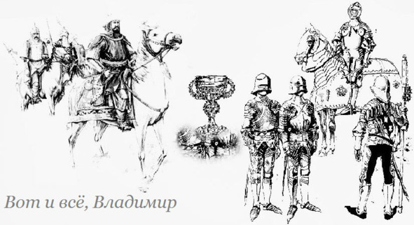 Второе. Мягко говоря, странная и противоречивая история монголо-татарского ига, которая изложена в книгах зарубежных и русских историков, не позволяет мне понять одно: почему непобедимая, хорошо вооруженная многочисленная Русь практически без сопротивления покорилась монголо-татарам? Например, падение столицы – Киева. Город, который по признанию всех специалистов-историков считался практически неприступной крепостью в Европе. И он пал уже на второй! Второй день монгольского штурма! Это кажется невероятным! И эти факты заставляют любого думающего человека более внимательно изучить предметы, в особенности, любые письменные упоминания, а их очень мало. По поводу «Священного Грааля», к которому уже не одну тысячу лет приковано внимание сильных мира сего, могу сказать следующее: Грааль – это некий предмет, состоящий из магического металла, упавший на землю из созвездия Ориона задолго до Христа. Его называли и одним из камней короны Дьявола, и якобы из него был изготовлен ритуальный сосуд – пожалуй, самая таинственная святыня христианства. Из него Христос причащал апостолов во время Тайной вечери. Упоминания о Чаше Иисусовой, Граале, фиксировались в Европе в середине – конце XII века. Ну, а после захвата крестоносцами Византийской империи Грааль считают навсегда утраченным. Схожий до мельчайших деталей есть и подобный сосуд на двух рисунках, где изображен Чингисхан. Я держал в руках эту фреску. На ней явно видно, что не Чингисхан владеет этим предметом – он просто его держит, а рядом изображен некий рыцарь, в сопровождении двух телохранителей, который и является обладателем Грааля. Стиль одежды рыцаря очень похож на то, как одевались знатные особы в центральной Европе…
