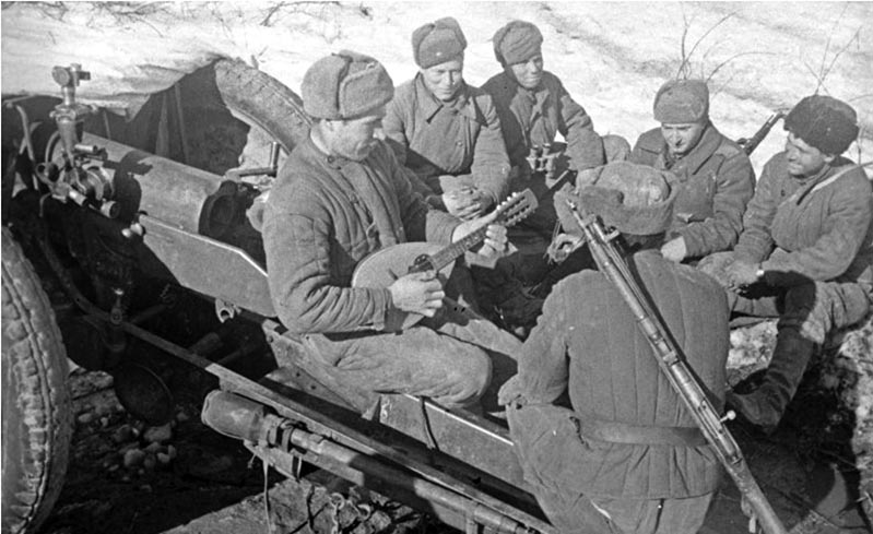 Расчет советской 76-мм полковой пушки образца 1927 года в минуты отдыха между боями. Бойцы слушают наводчика орудия младшего сержанта Михаила Ивановича Селина (1925 г. р), играющего на мандолине.
