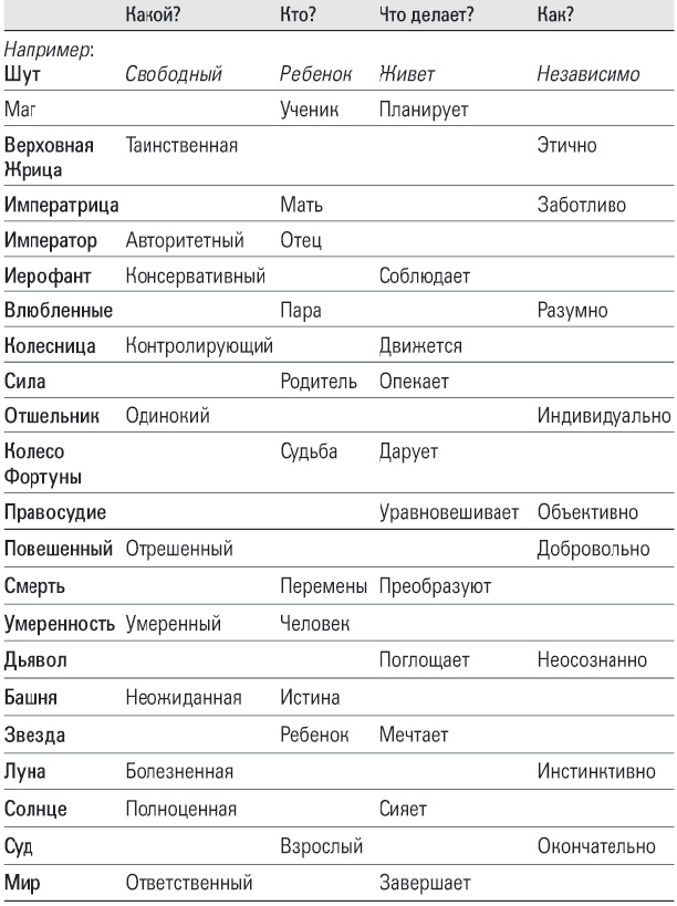 III. Дополните данную лингвистическую таблицу пропущенными словами. Вам нужно проанализировать основные значения Старших Арканов и написать недостающее существительное, прилагательное, глагол или наречие, чтобы получилась короткая формула, характеризующая каждый Аркан. Помните, что у каждого человека будет свой вариант этой таблицы.