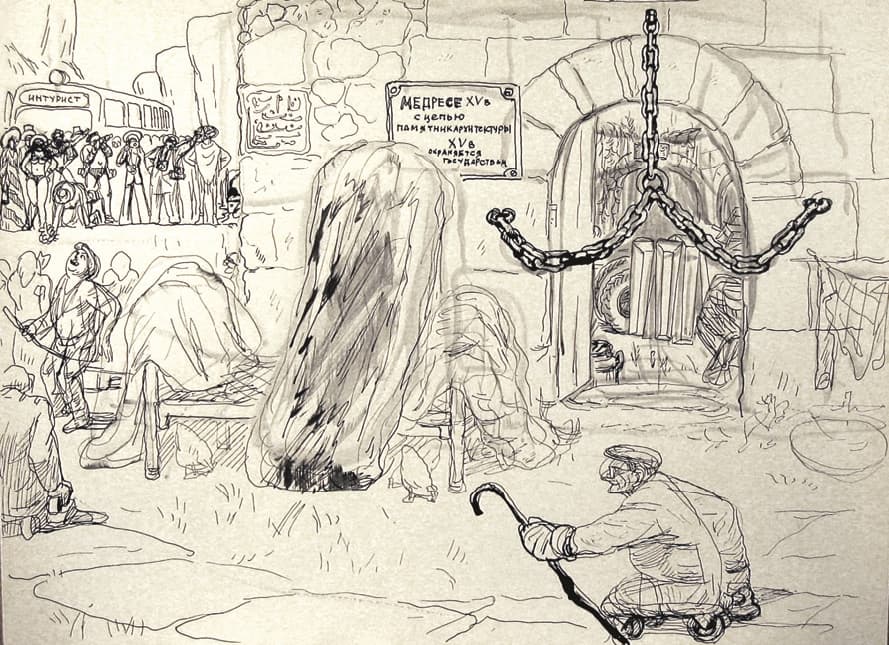 Дорога постепенно тянулась вверх и там раздваивалась. Одна часть продолжалась по правой стороне ручья, а другая переходила на левый берег и заканчивалась небольшим плоскогорьем, на котором располагался дом-интернат. Сам дом-интернат – это современные строения, но на его территории стояли два старинных каменных здания. Одно могло являться старой мечетью, внутри там были какие-то красивые каменные колонки, пилоны, раковины, выложенные камешками голубого цвета. А другое здание, бывшее медресе (школа для изучения Корана), не имело крыши. Вход туда шёл через стрельчатую арку, в проёме которой висела тяжёлая цепь. Но цепь спускалась не до пола, а специально была поднята на расстоянии примерно пояса, то есть, чтобы попасть внутрь, приходилось наклоняться. Человек нагибался, подлезал под эту цепь и в таком полусогнутом виде появлялся внутри здания. В этом медресе без крыши теперь работала столярка, где делались гробы, тут же они и хранились, а рабочие в перерывах пили пиво и вино, сидя на этих гробах.