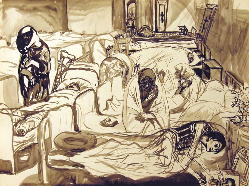 За этим инвалидом по фамилии Забара (украинская) ухаживала женщина по имени Таня, она его очень любила, помогала ему и ревновала его к санитаркам, которые приходили в палату во время обеда убираться. (Из-за слепоты Забара оставался в палате.) И эта Таня не находила себе места – и волновалась, и заглядывала в окна, и постоянно говорила: наверно, он там с ней целуется, наверно, она его обнимает (то есть санитарка). На руке у Тани синими чернилами был выколот номер. Я спрашиваю: Тань, что это за номер? – Она отвечает: я была в Освенциме, и это мой лагерный номер (он из шести цифр состоял). Когда я через несколько лет рисовал в Освенциме, мне сказали, что все узники с двух- и трёхзначными номерами погибли, а вот уже узников с большими номерами Красная армия успела освободить.