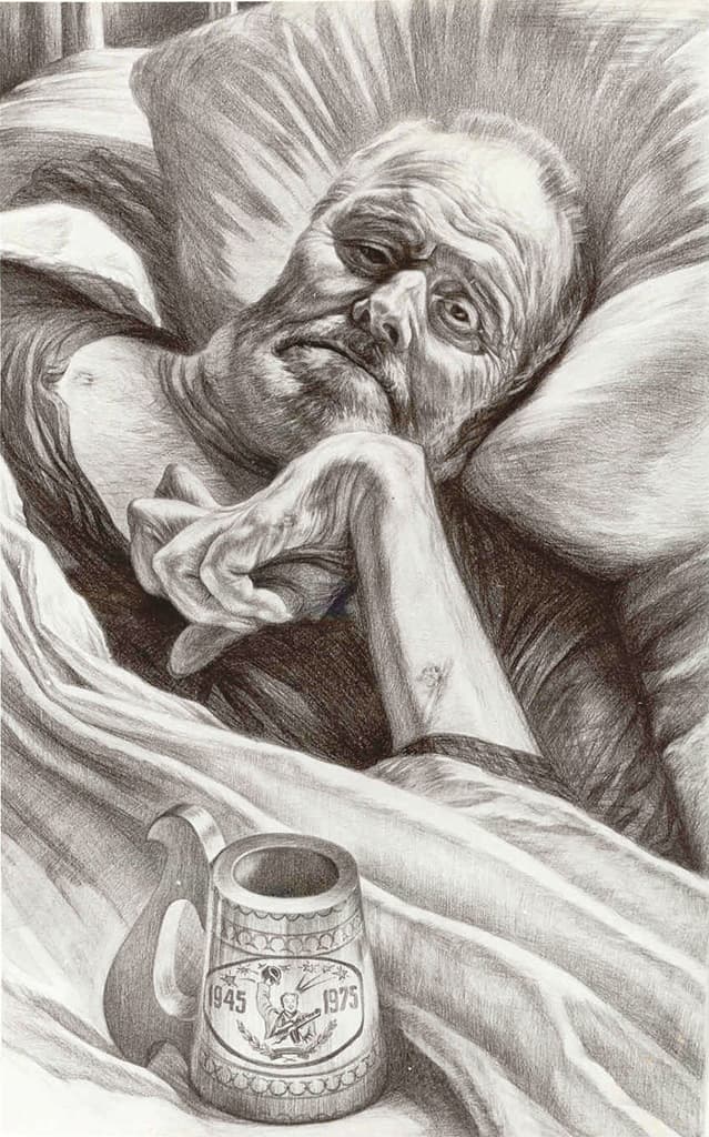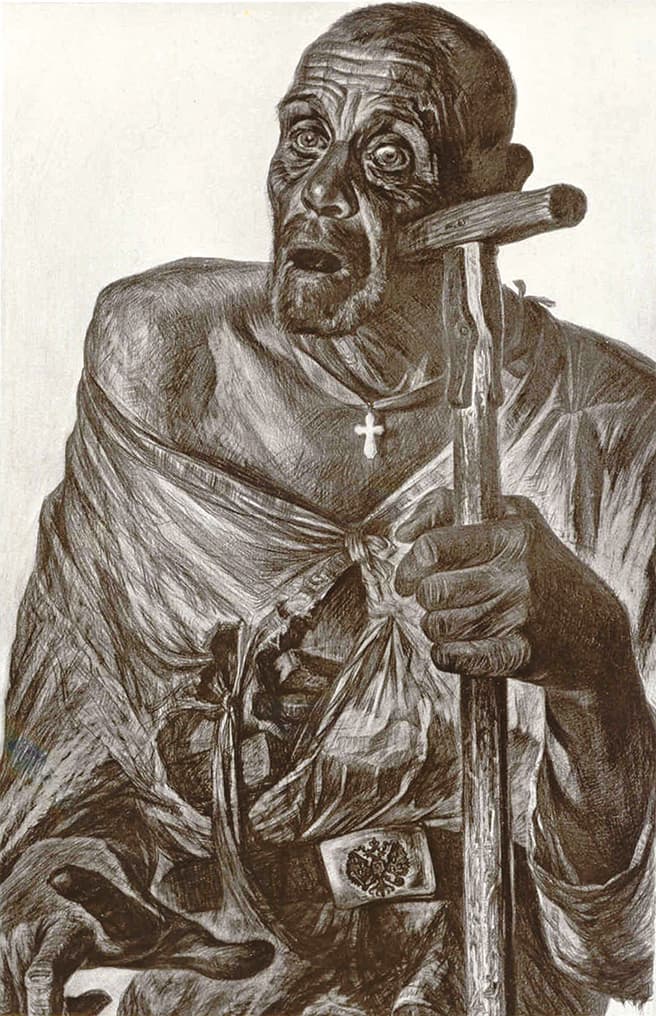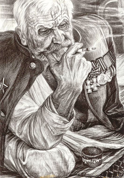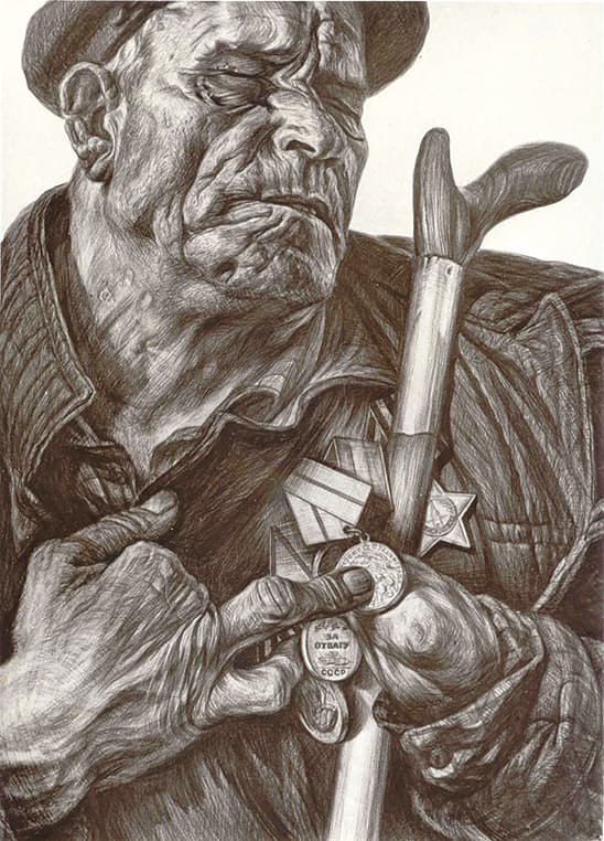 Я подошёл к другому пожилому инвалиду. Он был без обеих ног, прошёл несколько войн, оказалось, что ему уже девяносто лет. На кителе у него висели и ордена, и медали, и георгиевские кресты ещё за Первую мировую войну. Он сидел на кровати, курил, смотрел задумчивыми глазами, имел большие крестьянские руки с мощными пальцами и выглядел ещё довольно бодро. Я его нарисовал и назвал этот рисунок «Старый воин». Этот рисунок много раз показывался на выставках и печатался в прессе.