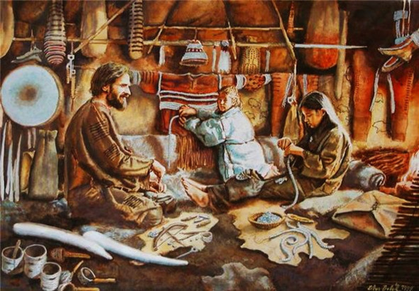 Рис. 10. Реконструкция жилища наших предков 25—30 тысяч лет назад по данным археологических раскопок. Убранство жилища на вид мало чем отличается от жилища кочевников двухсотлетней давности