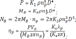 Соответствующие зависимости для упора, момента, мощности и КПД винта при упрощающем допущениях, что MB~n2p, NB~n3p выражаются формулами: