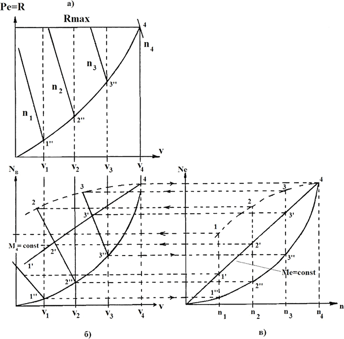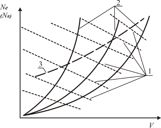 Если перенести кривые мощности, потребляемой винтом 2 в координаты NeГД = f(nГД), учитывая, что частоты ГВ и ГД равны или связаны через величину передаточного числа редуктора, то получим широко распространенную диаграмму скоростной характеристики двигателя Ne = f(n), которая является паспортной диаграммой пропульсивного комплекса «корпус – движитель – двигатель».