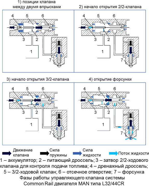 1) после получения команды на окончание впрыска закрывается 2/2-ходовой электромагнитный клапан, т. е. закрывается его затвор 3 для контроля подачи. Им же закрывается 3/2-ходовой клапан 5 (т. е. перемещается вправо на рисунке). При этом закрывается подача топлива из аккумулятора 1 в форсунку 7, открывается отсечное отверстие 6 и топливо из нагнетательной трубки и полости форсунки 7 стравливается в систему низкого давления;