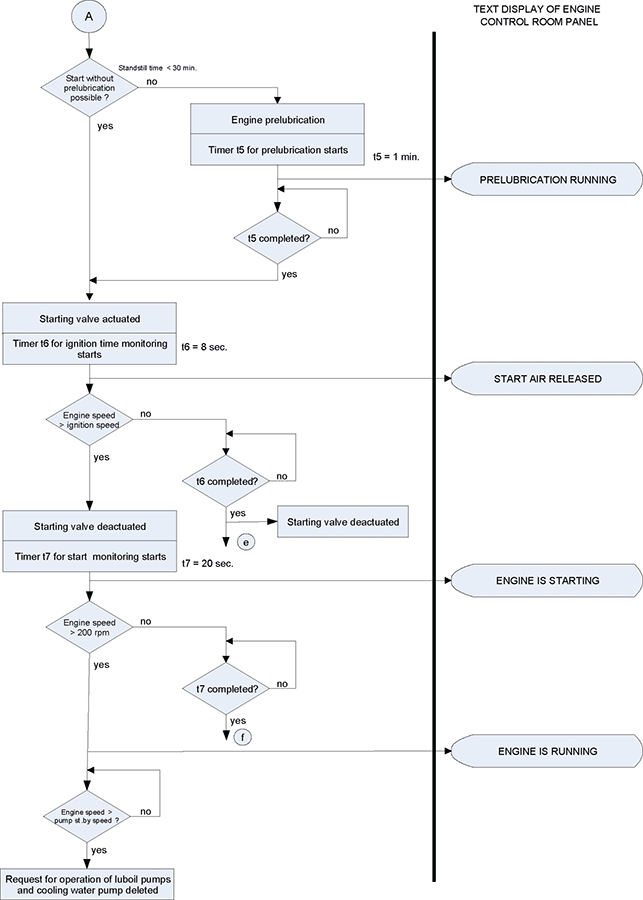 Непосредственно для подготовки к пуску, после получения команды с мостика на подготовку и пуск, производится запуск вспомогательного масляного насоса, для подачи масла в систему циркуляционного масла главного двигателя. После этого с помощью валоповоротного устройства осуществляется проворачивание двигателя не менее чем на 3 полных оборота.