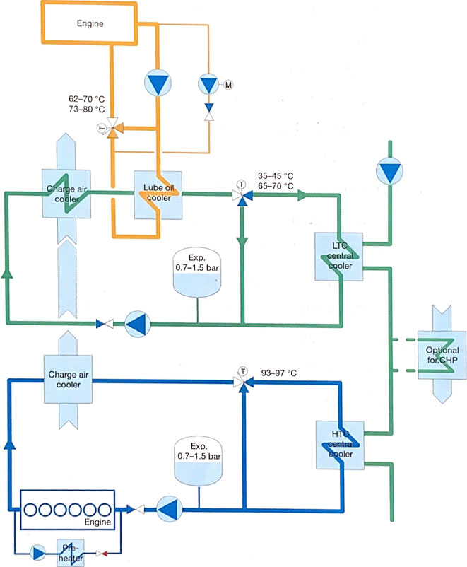 Применяются двухконтурные по пресной воде системы охлаждения. Пресная вода высокотемпературного контура охлаждает наддувочный воздух в первой ступени ОНВ.