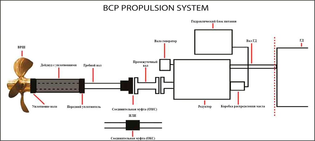На рисунке 1.23 приведена упрощенная схема ПК типа «ВСР Propulsion Systtm» с СОД, включающего в себя ВРШ, дейдвуд с уплотнениями, редуктор (Gear Box), отключаемую гидромуфту (Shaft Coupling), ВГ, гидравлический блок питания (Hudravlic Power Pack), ГД, валопроводы. Коробка распределения масла (OD box) преобразует заданные команду в гидравлический сигнал, который приводит в действие механизм вращения лопастей.