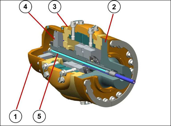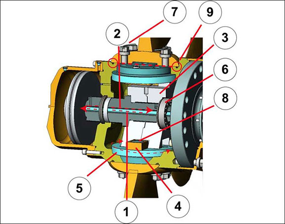 В гидроцилиндре находится поршень 4, который установлен на заднем конце штока поршня 5. Полый поршневой шток содержит масляную трубку, которая позволяет маслу под давлением течь либо вокруг трубки, либо через нее.