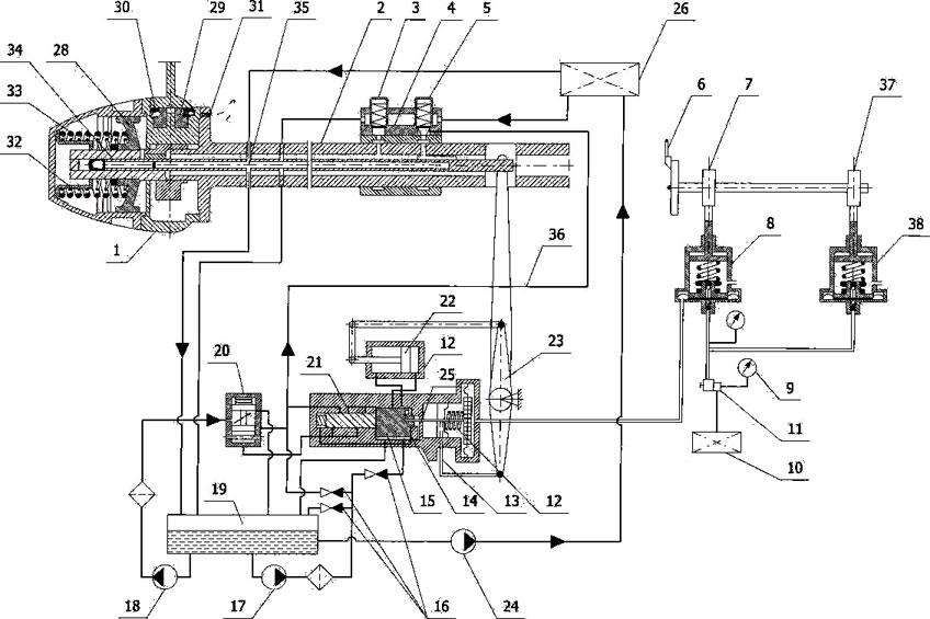 1- винт с поворотными лопастями; 2 – гребной вал; 3 – клапан, регулирующий давление в сливной магистрали; 4 – масловод; 5 – редукционный клапан нагнетающей магистрали; 6 – рукоятка главного поста управления; 7 – программный кулачок изменения шага винта; 8 – телемотор-задатчик винта; 9 – манометры; 10 – пусковой воздушный баллон ГД; 11 – редукционный клапан; 12 – вспомогательный сервомотор; 13 – телемотор-приемник шага винта; 14 – нерегулируемый дроссель; 15 – золотник; 16 – невозвратные клапана; 17 – насос удержания; 18 – насос перекладки; 19 – основной маслобак; 20 – разгрузочный клапан; 21 – поршень золотника; 22 – поршень вспомогательного сервомотора; 23 – рычаг обратной связи; 24 – насос поддержания высокого уровня масла в напорном баке; 25 – регулировочный штифт; 26 – напорный масляный бак; 27 – пружина; 28 – поршень; 29 – пальцевая шайба; 30 – уплотнительная манжета; 31 – предохранительный клапан; 32 – стакан; 33 – пружины; 34 – золотник маслораспределительный; 35 – управляющая штанга; 36 – масляный трубопровод; 37 – программный кулачок изменения частоты вращения ГД; 38 – задатчик частоты вращения.