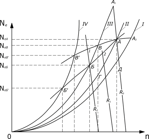 Кривая II представляет собой номинальную винтовую характеристику, относящуюся к расчетным условиям движения судна в полном грузу. Кривые 1 и 2 – соответственно внешняя и ограничительная характеристики дизеля, кривые III и IV – утяжеленные винтовые характеристики, кривая I – винтовая характеристика при плавании судна в балласте. Линии R0, R1, R2 – регуляторные характеристики.