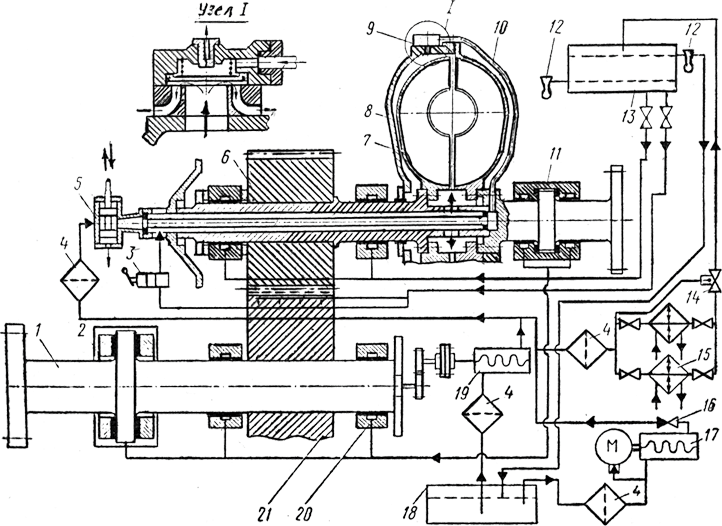 1 – вал отбора мощности на винт; 2 – главный упорный подшипник; 3 – управляемый клапан гидромуфты; 4 – фильтры; 5 – отсечной клапан гидромуфты; 6 – шестерня; 7,8 – роторы гидромуфты; 9 – управляемый сливной клапан; 10 – трубка подачи масла; 11 – упорный подшипник; 12 – поплавковое устройство включения резервного масляного насоса; 13,18 – напорная и маслосборная цистерны; 14,16 – терморегулировочный и невозвратно-запорный клапаны; 15 – охладители масла; 17 – резервный масляный насос с электроприводом и автоматическим управлением; 19 – основной масляный насос; 20 – опорные подшипники; 21 – зубчатое колесо