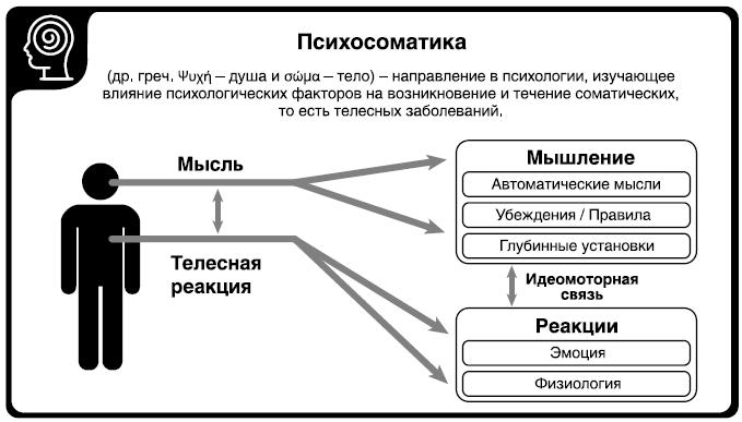 Идея конфликта основана на противоречии между поведением человека и его внутренним нравственным законом. Согласно теории стресса Ганса Селье болезнь наступает в результате накопления эмоционального напряжения при отсутствии возможности его сбросить. Например, крысы, переживавшие длительный стресс, умирали от различных соматических заболеваний: начиная от язв, которыми покрывался их желудок, и заканчивая разрывами сердца и даже онкологическими заболеваниями. Иными словами, психодинамическая теория предполагает возникновение болезни в ситуации, где мы испытываем крайнее напряжение и не можем дать ему выход. В отличие от крыс у человека возникновение такой ситуации связано с его поведением, которое противоречит его же представлениям о том, каким оно должно быть на самом деле. В обычной ситуации человек подгоняет свои действия под имеющиеся этические установки, но, когда такой возможности нет и нет возможности отказаться от этих действий, начинает накапливаться стресс, признаком которого может быть невротизация со всеми ее признаками: повышенным потоотделением, одышкой и т. д. Эту картину мы наблюдаем у людей, которые склонны сдерживать свои чувства из-за запрета, усвоенного в детстве. В таких случаях невозможность выражать, например, агрессию ведет к тому, что человек не отстаивает себя и социально пассивен. Это не значит, что чувства обиды и гнева ему не знакомы. Они такие же, как у всех, но не находят себе выражения (как правило, это действия, направленные на защиту своих интересов, когда человек настаивает на своей позиции), поэтому необходимого выброса гормонов не происходит. Нарастающее напряжение приводит к гипертонии и спазмам, что чаще всего проявляется как проблемы с желудком и в сексуальной сфере.