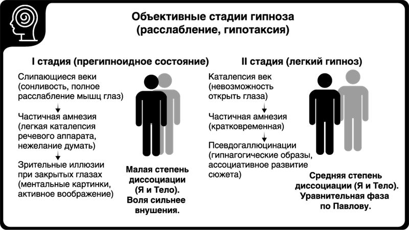 Каждый человек, занимающийся гипнозом или интересующийся им должен понимать, что первая стадия суггестии (от лат. suggestio – внушение) – это игра в гипноз. Вторая – «настроение гипноза», когда у гипнотизируемого возникает частичная потеря контроля за телом, оцениваемая многими как эффект плацебо. Третья стадия представляет собой спор реальности и внушения, который преодолевается расслаблением – дальнейшим торможением умственной деятельности в сочетании с признанием авторитета гипнотизера. Когда пациент расслаблен физически, мы получаем средний гипноз. Когда же человек одинаково расслаблен физически и ментально – это уже состояние сомнамбулизма. Сначала надо убедиться, что пациент расслаблен физически. А затем усиливать это состояние до тех пор, пока не станет ясно, что его сознание расслаблено так же сильно, как и тело. Если человек чувствует дискомфорт, раздражение или страх, он не может быть расслаблен ментально, потому что эти импульсы беспокойства постоянно передаются ему в мозг. Когда же в мозг не поступают тревожные импульсы, а только позитивные, которые внушает специалист, мозгу не нужно реагировать на все происходящее, и таким образом он перестает быть активным из-за отсутствия беспокойных мыслей и становится восприимчив к внушениям.