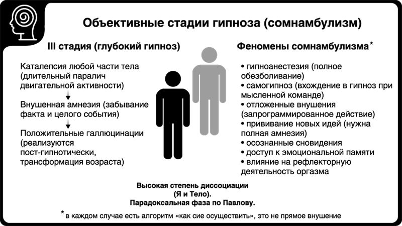• И, наконец, глубокий гипноз (сомнамбулизм), когда внушения выполняются беспрекословно.