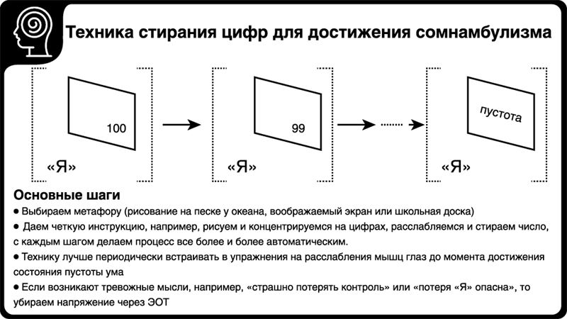 Самая желанная стадия – сомнамбулизм – моделируется стиранием чего-то, что субъект забудет: число или название родного города.