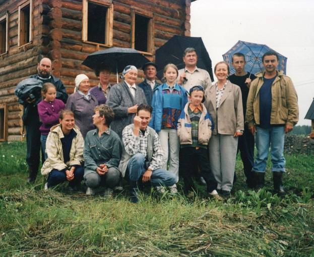 Реконструкция дома Вахрамея Атаманова. Родственники и съемочная группа ТВ из Москвы. 1999 г.