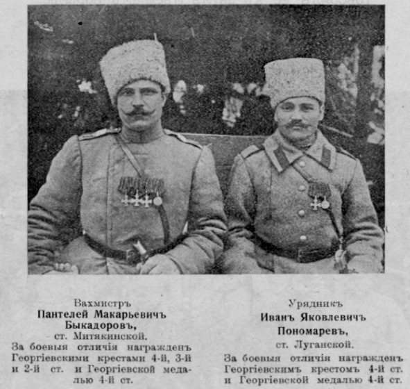 Георгиевский крест 2 ст. №7026 БЫКАДОРОВ Пантелеймон Макарович – Казак станицы Митякинской, х Каюков. 10 Донской каз. генерала Луковкина полк (9 Донской каз. генерал-адъютанта графа Орлова-Денисова полк?), мл. урядник. За то, что находясь в прикомандировании к ополченской дружине в качестве взводного командира, в бою 19.05.1915 у с. Луг, под сильным неприятельским огнем, первый дошел до неприятельских проволочных заграждений, увлекая за собой нижних чинов и принимал участие в уничтожении заграждений. [III-39466, IV-144759]
