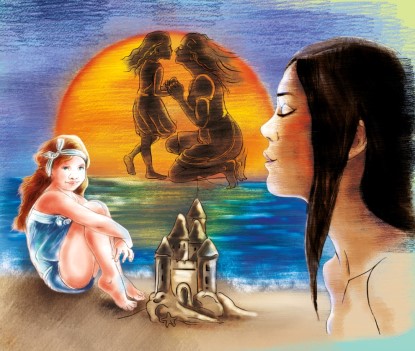 Представьте, что замок построен и вы оба испытываете радость, что вместе сделали это. В какой-то момент ваши взгляды встречаются, и вы нежно обнимаете эту девочку