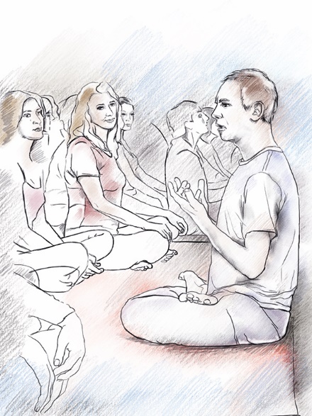 1.2.2. Настройка на практику. Мантра ОУМ. Настройка на практику начинается с того, что преподаватель спокойным, ритмичным голосом усаживает всех в удобную сидячую позу и начинает проговаривать заранее подготовленный текст. В общих чертах это происходит следующим образом: