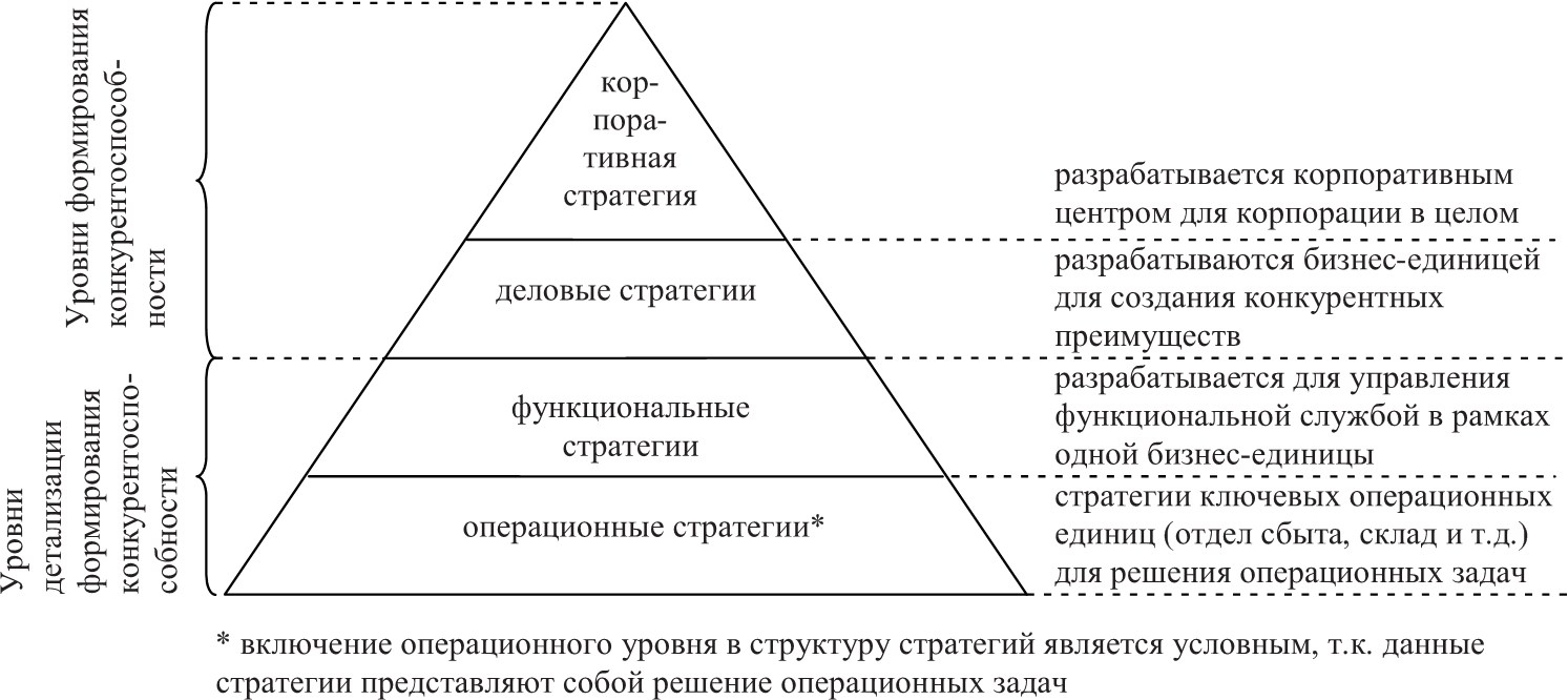 Нижние два уровня иерархической структуры разрабатываемых стратегий также участвуют в формировании конкурентоспособности. Они детализируют и уточняют стратегию бизнес-единицы в рамках функциональных служб (производства, маркетинга, финансов, НИОКР, персонала) и выполнения операционных задач.