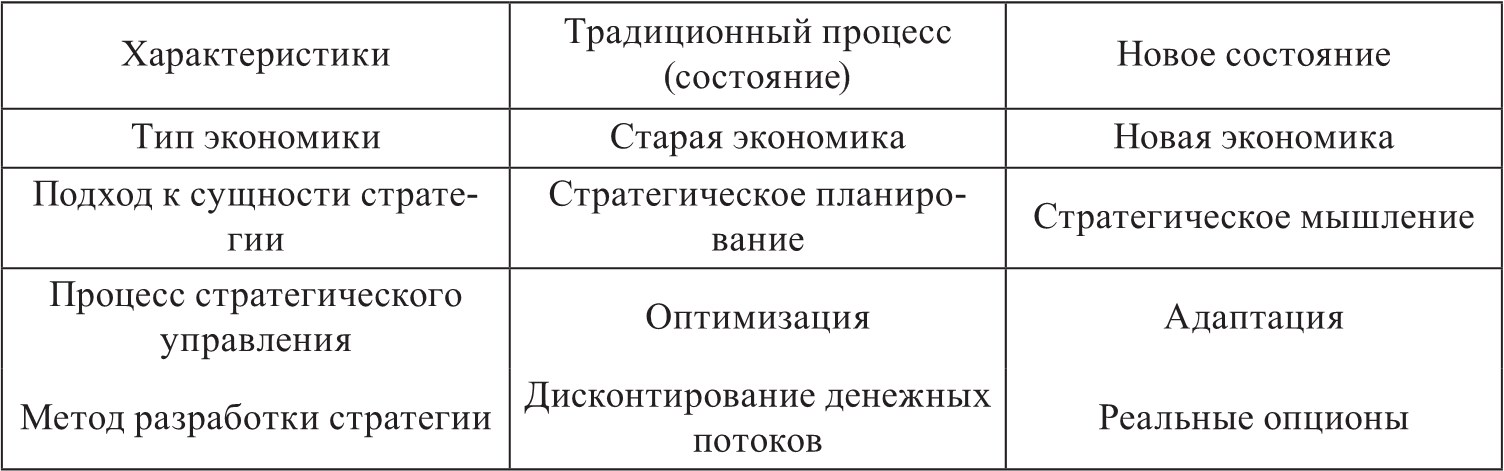 Г. Минцберг [134] выдвигает похожую точку зрения. Он предполагает, что стратегическое планирование, как исторически практикуемое, в действительности представляет стратегическое программирование: соединение стратегий развития, которые уже существуют. Он продвигает стратегическое мышление, которое объединяет интуицию и творчество. Б. Артур и Г. Минцберг «представили таблицу, в которой сравнивается старая и новая экономики» (цит. по: [132, c. 9]) (табл. 2). В.С. Катькало характеризует подобные изменения «смещением акцентов со стратегического выбора на стратегические изменения» [36, c. 392].