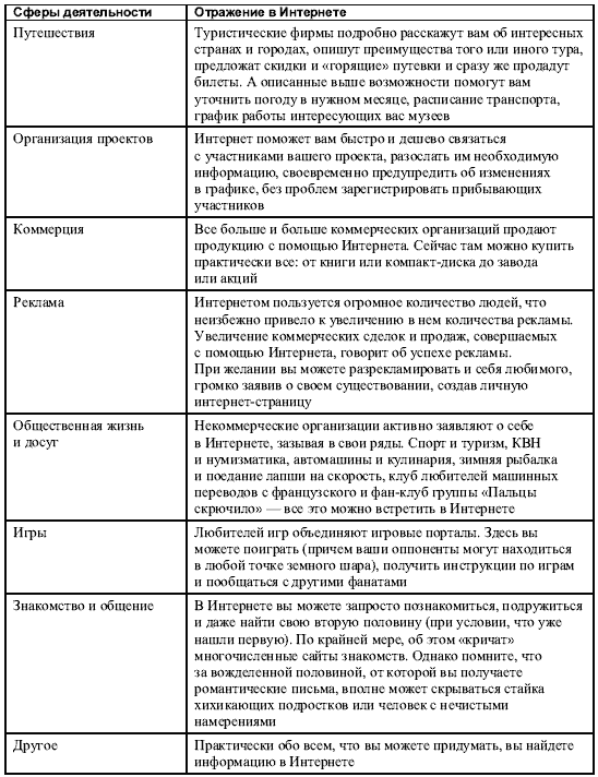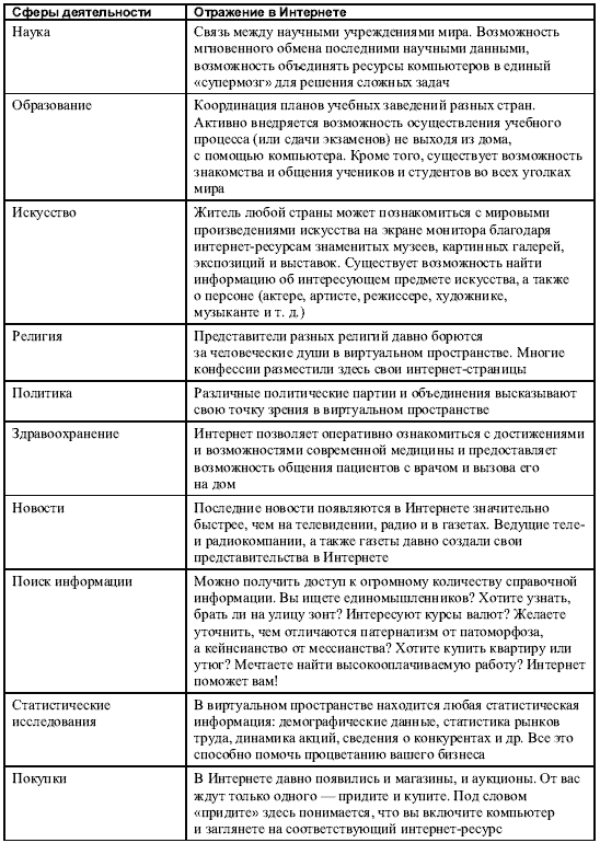 С помощью Интернета уже давно делают покупки, подписывают договоры, заключают браки и принимают на работу. На интернет-аукционах вполне можно купить какую-нибудь ерунду, а можно даже ценную вещь. В интернет-казино виртуально можно проиграть крупную сумму реальных денег. В Интернете можно найти и много полезной информации, и горы развлечений, и море газет, и массу глупостей, и легион пошлости. В общем, абсолютно все, что человечество имеет в жизни реальной, оно перетянуло в жизнь виртуальную. Чтобы было понятно, насколько Интернет охватил все сферы человеческой деятельности, предлагаю ознакомиться с табл. 1.1.