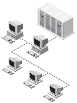 – Если сеть имеет центральный компьютер, который управляет ее работой, то она называется сетью с выделенным сервером. Предваряя недоуменные вопросы, сразу поясню, что сервер – это самый главный компьютер в сети, который получает запросы от подключенных к нему компьютеров, обрабатывает эти запросы и решает, соединить ли просителя с нужной информацией (хранящейся на другом компьютере) и разрешить ли ему напечатать документ на общем принтере или нет у него на это никаких прав.