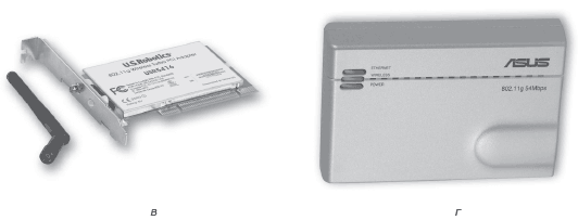 Чтобы соединить хотя бы два компьютера в сеть, вам понадобятся специальные устройства. Во-первых, компьютеры должны быть оборудованы сетевым адаптером (сетевой картой). На рисунке 1.4 показаны внутренний сетевой адаптер (он устанавливается на материнской карте компьютера) (рис. 1.4, а), внешний сетевой адаптер (он подсоединяется к USB-порту компьютера) (рис. 1.4, 6) и беспроводные адаптеры (с ними для сетевого соединения провода не нужны) (рис. 1.4, в, г).