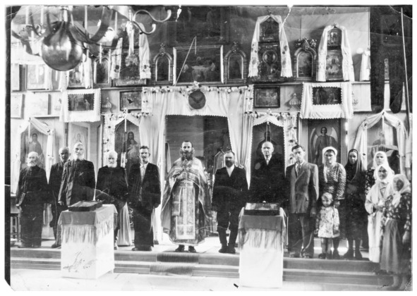 Верхне Митякинская Иоанно Богословская церковь на кануне закрытия в 1956 году. Иерей Димитрий в центре. Не смотря на то, что церковь закрыли служба продолжалась на паперти 7 лет.