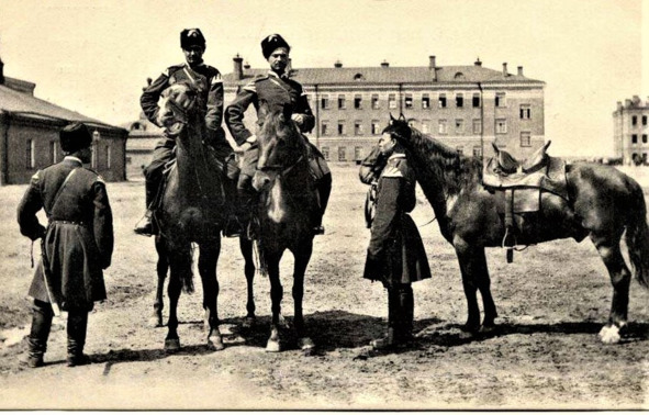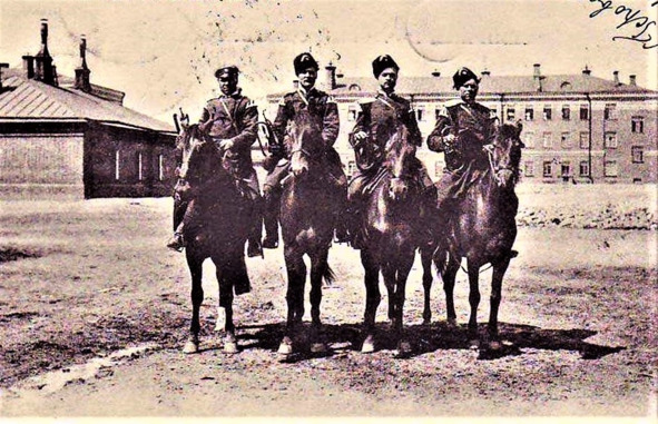 Казаки трубачи 10 Донского казачьего полка. На заднем плане казарма и штаб полка. Всмотритесь в эти лица, быть может среди этих казаков есть ваши предки. 2 фото.