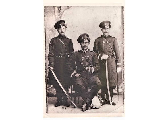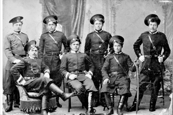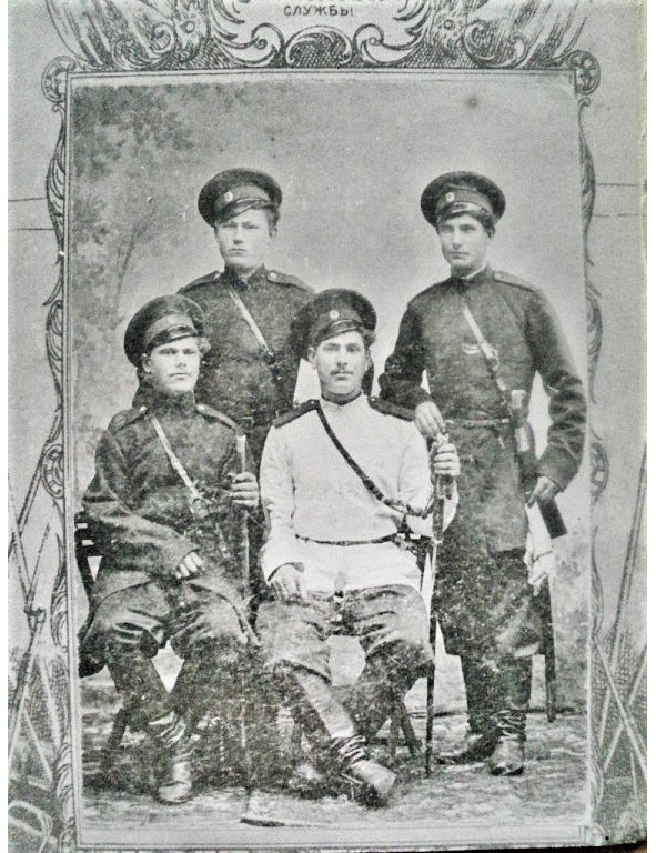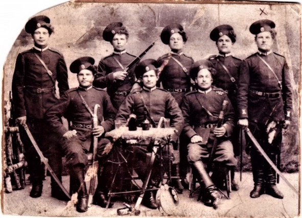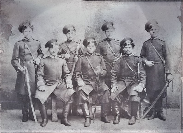 Грешнов Пётр Антонович стоит справа на фото, будущий атаман хутора Никишин во время службы в 10 ДКП. Казаки х. Никишин. Рядом с ним прадед Грешнова Николая – Никишин Яков Степанович. Фото Грешнова Николая.