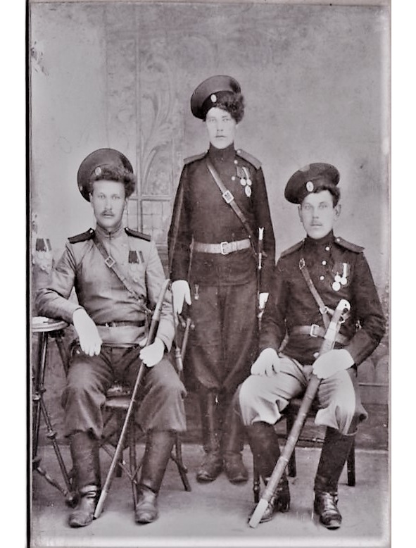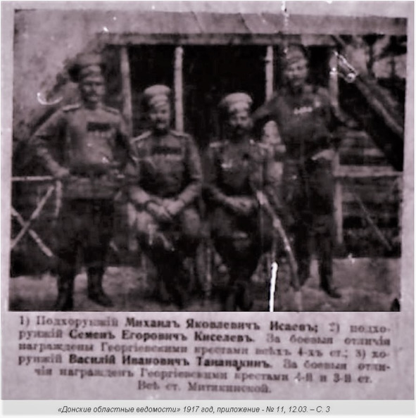 Фото из газеты «Донские областные ведомости». Казаки полные Георгиевские кавалеры станицы Митякинской. Первый слева Исаев Михаил Яковлевич, Киселёв Семён Егорович, Тананакин Василий Иванович. хуторов Средне и Нижне Митякинских.