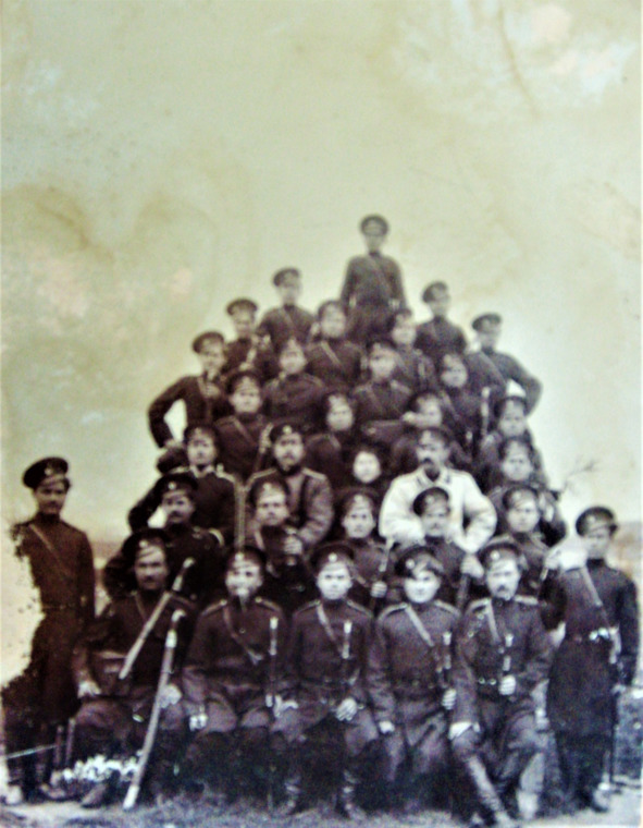 Фото Можаева А. Н. Казаки 10 Донского казачьего полка перед японской войной. В центре в белой гимнастёрке прадед Можанева А. Н – Тихан.