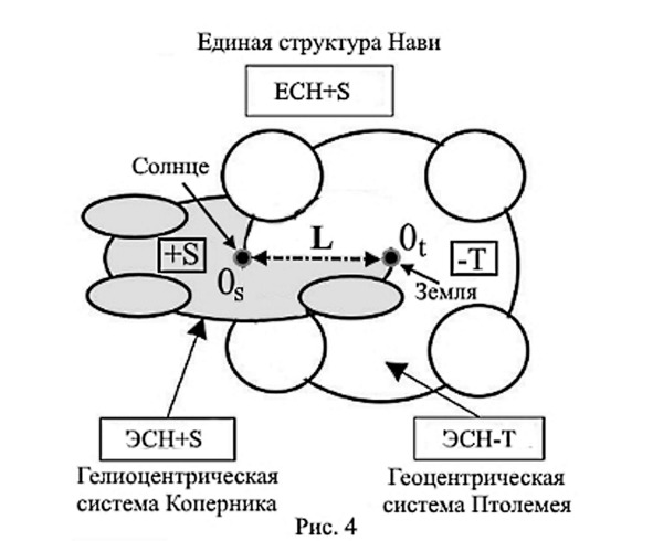 ЕСН рисунка 4 представляет собой диполь, который имеет пространственно-временной заряд. С одной его стороны он будет зарядом Пространства, с другой – зарядом Времени. ЕСН сами могут соединяться между собой, образуя более сложные элементы Структуры. Например, одна ЕСН образует структуру атома водорода; две ЕСН – атома гелия; три ЕСН – атома лития и т. д. [6] На рисунке 4 мы даже показали, что эта ЕСН объединяет собой две планетарные системы: гелиоцентрическую систему Коперника и геоцентрическую систему Птолемея.