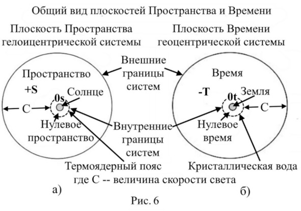 Аналогичное строение имеет геоцентрическая система Птолемея в плоскости отрицательного Времени, показанная на рисунке 6б. Она будет зеркальным отображением гелиоцентрической системы Коперника. Эта система находится в плоскости Времени, имеющей внешнюю и внутреннюю границы. За внутренней границей, которой является пояс кристаллической воды, времени более нет. Здесь находится его нулевой центр с внутренним пространством этой системы. В нём располагается пространственная планета Земля. Отношение величин между внутренней и внешней границами обоих систем будет кратно скорости света С.