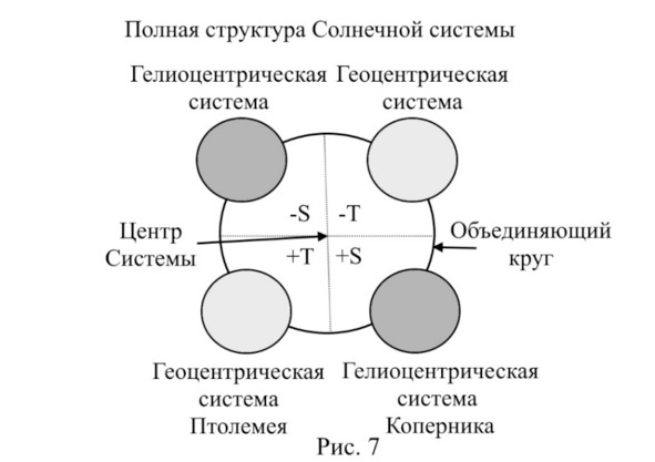 Большой круг имеет свой центр, который можно признать центром масс Солнечной системы. Именно вокруг него должны вращаться её четыре системы. Не Земля вращается вокруг Солнца, как в гелиоцентрической системе Пространства, и не Солнце вращается вокруг Земли, как в геоцентрической системе Времени, а они оба вращаются вокруг центра масс большого круга рисунка 7. К ним ещё добавляются две другие планетарные системы. Не много ли у нас получается планетарных систем внутри Солнечной системы?
