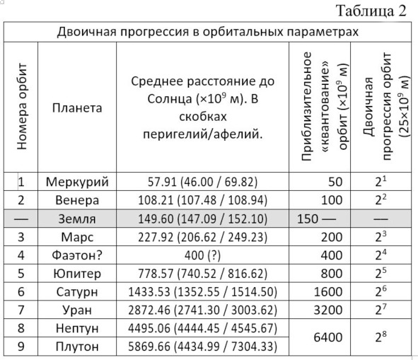Теперь давайте немного дополним таблицу 1, для чего покажем в ней истинную двоичную прогрессию, но, опять же, без планеты Земля. Изобразим её в последнем столбике таблицы 2. Получается довольно точная двоичная прогрессия в параметрах орбит планет. Мы даже можем её признать истинной. Только теперь начальная величина орбитального расстояния стала другой – 25×109 м.