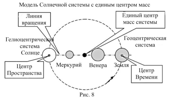 Учёные предполагают наличие центра масс этой системы где-то внутри Солнца. Но они исходят в своих вычислениях только на массе пространственной части гелиоцентрической системы Коперника и совершенно не учитывают геоцентрическую систему Времени Птолемея, которая имеет свою массу в этой единой системе. Поэтому мы всё же предполагаем центр масс системы на её среднеарифметическом расстоянии между Солнцем и Землёй, учитывая и предполагая обязательное равенство масс этих двух систем: гелиоцентрической и геоцентрической. Иначе система окажется неустойчивой и не уравновешенной, что никак не может быть.