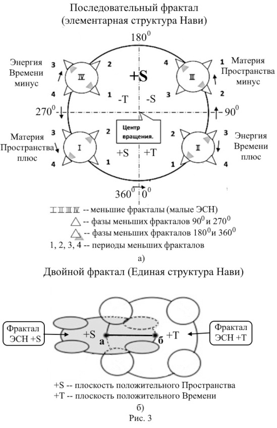 На рисунке 3а мы определились с Пространством и Временем, имеющими разные знаки состояний (+S, +Т, —S, —Т). Их параметры внутри ЭСН могут быть любыми: например, для атома – это одни параметры, а для галактик – другие. Структура ЭСН от этого не изменится. Даже если мы полностью уберём все субстанции из её структуры, то она не перестанет существовать, но обратится в подобие «математической точки», структурно оставаясь всё той же «моделью пяти колец», как показано на рисунке 3а. Структура ЭСН представляется нам «неубиваемой» и вечной. Она и послужила нам прообразом универсального фрактала рисунка 1а.