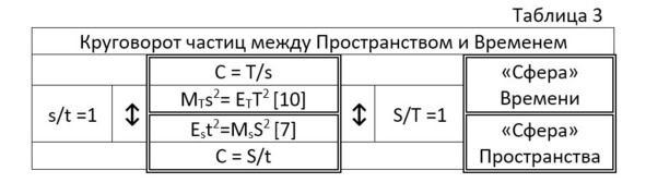 В центре таблицы 3 записаны формулы 7 и 10, выше и ниже их записаны соотношения их внутренних времени и пространства соответственно. Самым интересным для нас сейчас является то, что наше третье единичное условие «работы» формул 7 и 10 наконец-то проявило себя. Мы видим, что при равенстве времени и пространства они могут переходить друг в друга. Из «сферы» Пространства переход частиц в «сферу» Времени будет происходить, например, так: материальная частица пространства MS при переходе из пространства во время становится частицей энергии Ms уже «сферы» Времени. Точно так же энергетическая частица Et перейдёт в «сферу» Времени частицей ET, и наоборот. Давайте попытаемся понять, каким образом таблица 3 влияет на нашу жизнь? s Т s Т 2 2 2 2