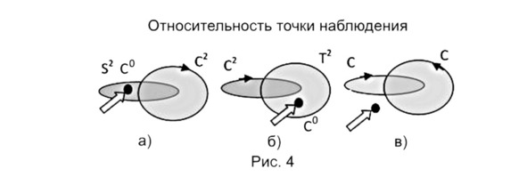 Мы много говорили об относительности при рассмотрении «работы» своих формул. На рисунке 4 представлены три относительные точки зрения, которые соответственно представляют собой: мир Пространства (рис. 4а); мир Времени (рис. 4б); вне миров Пространства и Времени (рис. 4в). Если наблюдение ведётся из мира Пространства (рис. 4а), то мы имеем точку наблюдения в Пространстве, то есть нашу обычную пространственную точку зрения. В этом случае скорость света в пространстве будет равна С, а во внутреннем времени – С. Если, ничего не изменяя, просто перенести точку наблюдения в мир Времени (рис. 4б), то у нас уже по такому же принципу образуется точка зрения из него. Тогда скорость света в нём будет равна С, а в пространственном секторе С. Если мы вынесем точку наблюдения вне миров Пространства и Времени, то мы получим нечто единое, которое соединяет в себе и Пространство и Время. Скорость света в обоих плоскостях будет равна С. 0 2 0 2 1
