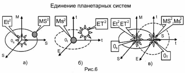 Получается очень интересная картина: на рисунке 6б Солнце вращается вокруг нашей планеты; Земля находится в центре энергетической временной системы из трёх координат. Правыми могут оказаться и те, кто утверждал, что Земля вращается вокруг Солнца (рисунок 6а), и те – что Солнце вращается вокруг Земли (рисунок 6б). Этот процесс может проходить, пожалуй, одновременно.