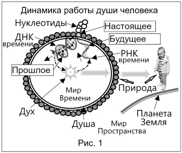 Неотработанную ДНК (РНК) времени души мы вполне можем определить, как наше будущее, которое ещё не проявлено в Природе. ДНК времени, которая уже отработана Природой, мы определяем, как наше прошлое, которое, как мы видим, запоминается нашей душой и духом через нуклеотиды ДНК. Нуклеотид, который находится в работе мы вполне можем представить нашим настоящим. Вот откуда могут возникать наши настоящее, прошлое и будущее. Конечно, мы только обозначили процесс работы духа и души, но даже он показал нам, как происходит наше становление посредством Природы.