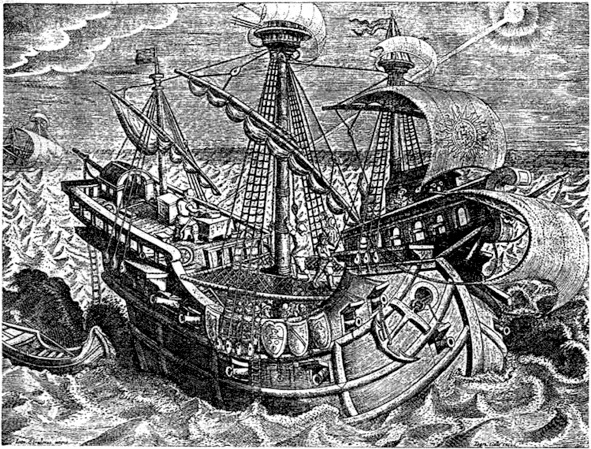 Погрузившись на дно морское, гигант вскоре всплыл, и водные струю стремительными водопадами стекали по его переливающейся чешуе. В руках его были камни и кораллы, обломки подводных скал и рифов, которые он тотчас же начал метать в Ваш корабль.