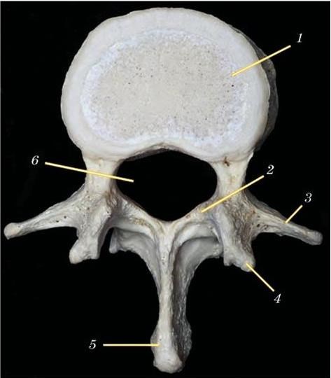 1 – тело позвонка; 2 – дуга позвонка; 3 – поперечный отросток; 4 – верхний суставной отросток; 5 – остистый отросток; 6 – отверстие позвонка