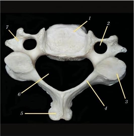 1— тело позвонка; 2 – отверстие поперечного отростка; 3— верхний суставной отросток; 4 – дуга позвонка; 5 – остистый отросток; 6 – отверстие позвонка; 7 – поперечный отросток