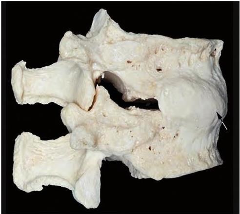 Рис. 6. Синостозирование – срастание в единую кость XI и XII грудных позвонков (указано стрелкой). Натуральный анатомический препарат